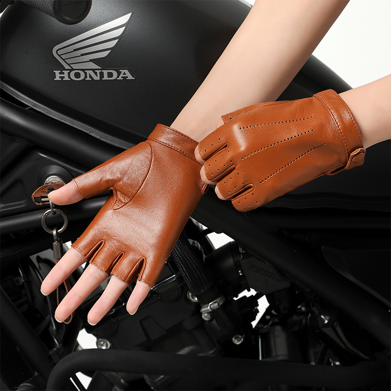 指先部分が開放されたレディース専用の本革製バイクグローブです。